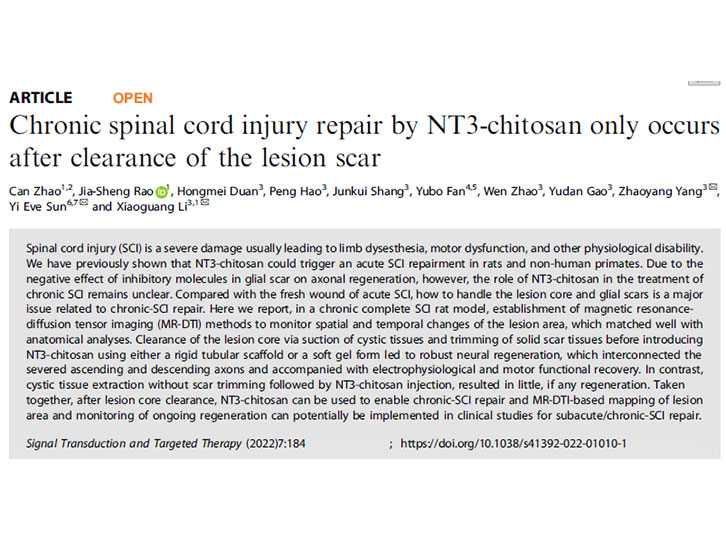 2022年6月17日,Nature旗下的《Signal Transduction and Targeted Therapy》杂志发表了18luck下载康复工程研究所赵璨博士与北京航空航天大学生物与医学工程学院李晓光教授团队共同合作,在陈旧性脊髓损伤修复领域取得新进展:《Chronic spinal cord injury repair by NT3-chitosan only occurs after clearance of the lesion scar》。