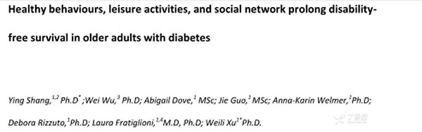 原文出处: Shang Y, Wu W, Dove A, et al.Healthy behaviours, leisure activities, and social network prolong disability-free survival in older adults with diabetes.J Gerontol A Biol Sci Med Sci 2022 Mar 03