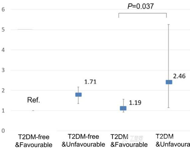 图1. 健康行为、积极的休闲活动和中等到丰富的社会网络对残疾/死亡风险的联合关联(根据对基线年龄组、性别、教育程度、生活状况、体重指数、心血管疾病、脑血管疾病、抑郁症和高血压进行调整的Cox回归模型进行调整)。“良好形象”指的是至少有一种健康的行为、积极参与休闲活动或中等至富裕的社交网络。“不良形象”指的是没有任何健康的行为,没有积极参与休闲活动,或者没有中等到丰富的社交网络。HR:危险比;CI:可信区间p=0.037是指“T2 DM+有利”组与“T2 DM+不利”组复合终点风险差异的显著水平。