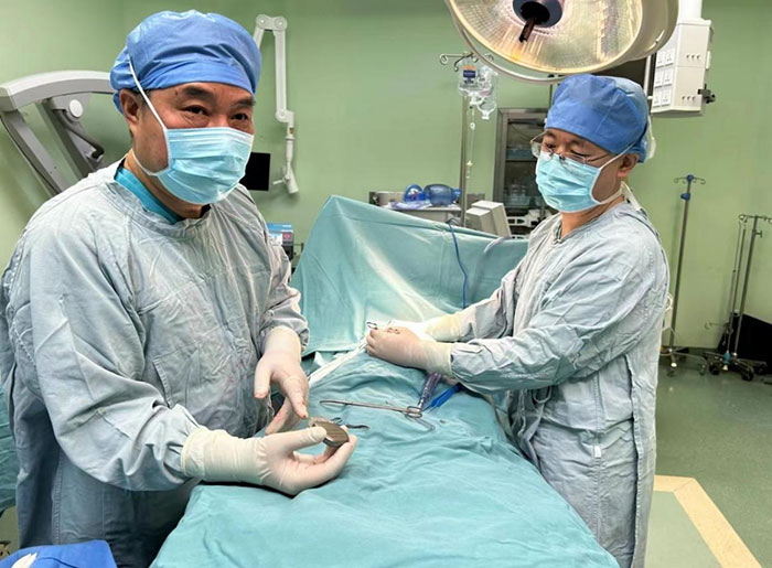 图为廖利民教授和陈国庆教授在为患者进行六触点电极骶神经调控系统植入手术