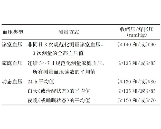 高血压定义:在未使用降压药的情况下,诊室血压≥140/90 mmHg;或家庭血压≥135/85 mmHg;或24 h动态血压≥130/80 mmHg,白天血压≥135/85 mmHg,夜间血压≥120/70 mmHg。