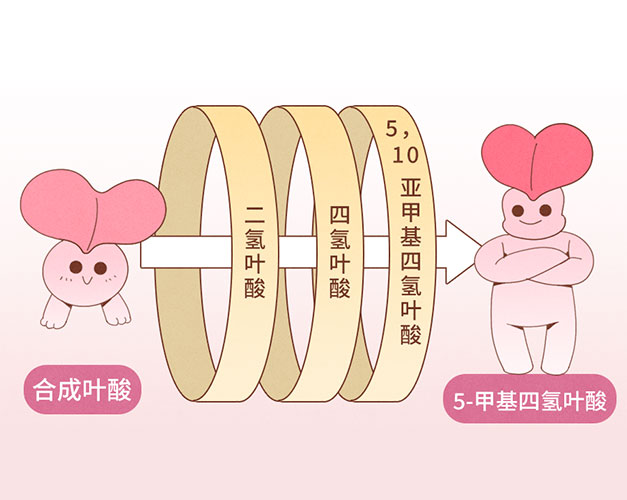 市面上常见的普通叶酸补充剂,需要通过酶催化为 5-甲基四氢叶酸,才能参与到 DNA 合成中。
